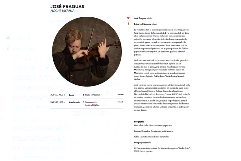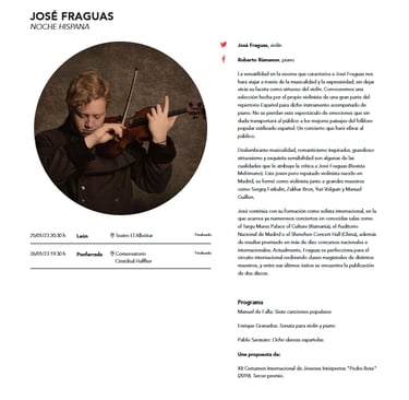 Una selección de grabaciones, registros audiovisuales y proyectos discográficos que recogen distintas líneas del trabajo artístico de José Fraguas, entre la recuperación del patrimonio violinístico español, la actividad concertística y la creación propia.